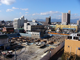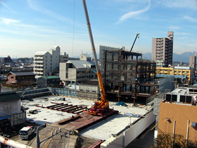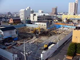 H17.3.12-鉄骨建てが完了し、防護ネットも全てに張り巡らされ、壁面作業が開始されています。内装工事が主な作業となり、外観上の変化が少なくなってきました。防護ネットが取り外される頃まで、掲載を少し見合わせて戴きますのでご了承下さい。 |