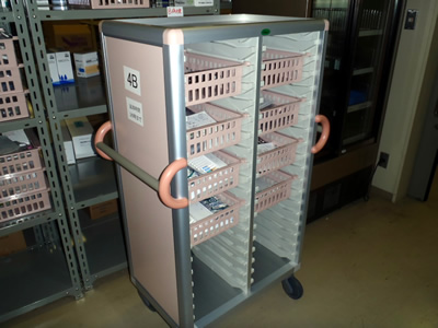 病棟ごとに担当の薬剤師を配置し、病棟の救急カート、緊急用の常備医薬品の保管状況、数量、期限チェックを定期的に行っています。