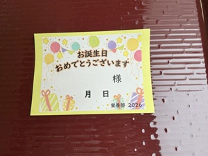 入院中にお誕生日を迎える患者様にケーキとお赤飯、バースデイカードをおつけしています。患者様の大切な1日をお祝いさせていただきます。 |