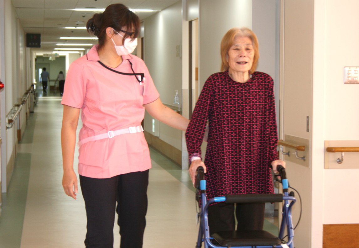 回復期リハビリテーション病棟は、脳血管疾患または大腿骨頚部骨折などの病気で急性期を脱しても、まだ医学的・社会的・心理的なサポートが必要な患者さんに対して、多くの専門職種がチームを組んで集中的なリハビリテーションを実施し、心身ともに回復した状態で自宅や社会へ戻っていただくことを目的とした病棟です。